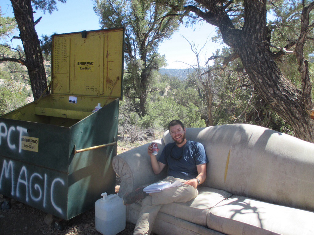 That day we hiked past the “animal cages.” I was looking forward to seeing the animals. They are celebrity animals! Boy was that also a bad idea! It was so depressing when we hiked by. In teeny tiny cages I saw a grizzly bear. It was hot out, and he had no shade. He sat slumped over, and looked very depressed. It made me upset to see such a magnificent creature in a cage. We hiked on. We came across a big tool box with “pct magic” written in spray paint. We opened it up and there was soda and a log book! We sat on the very convenient couch located there on the side of the trail and enjoyed the treats! We camped about 10 miles outside of the highway leading to Big Bear that night.