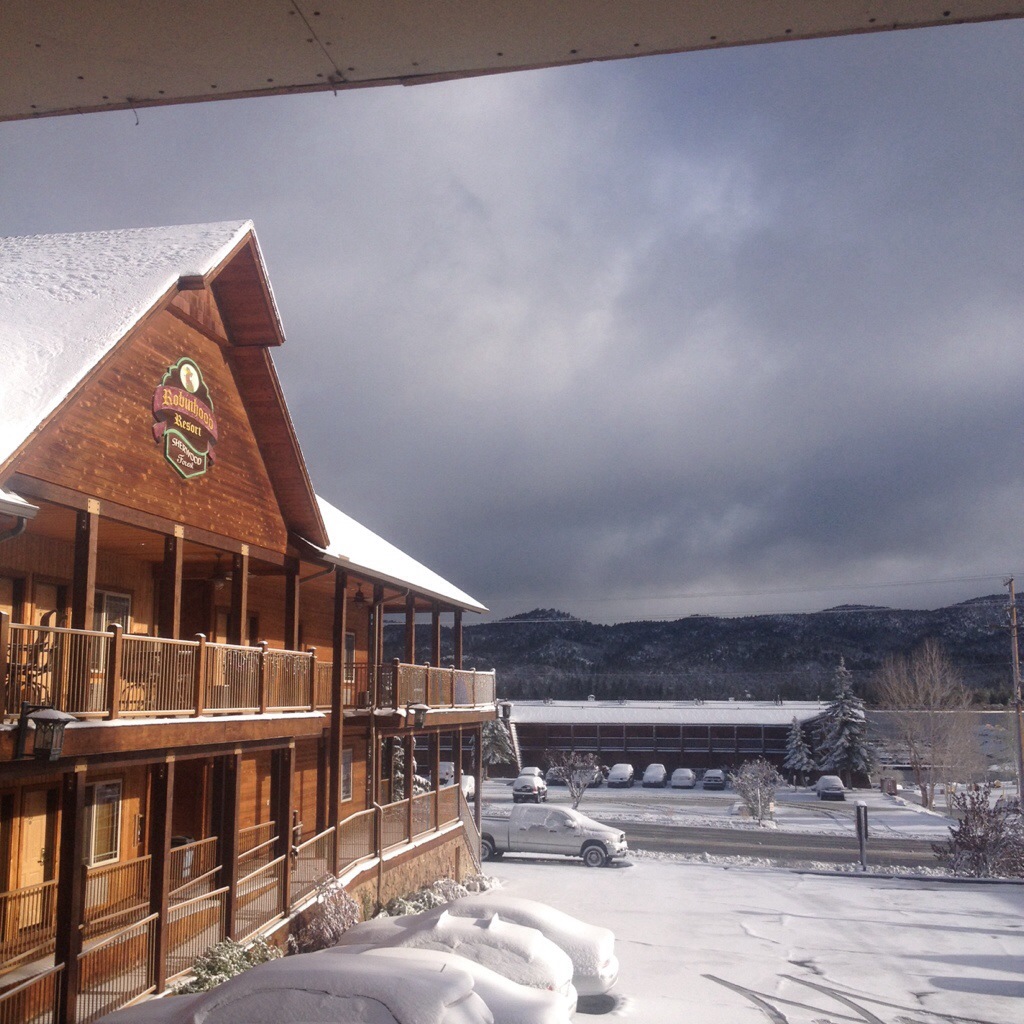 The following morning we woke to SNOW! The cars in the parking lot were covered, the streets were buried and the mountains on the other side of the lake in the distance were white. How lucky we were to have headed into Big Bear for the night. I almost felt guilty for having spent the night in a warm hotel with a fireplace. It would have been kind of fun to have been out there while it snowed. Cold, but fun.